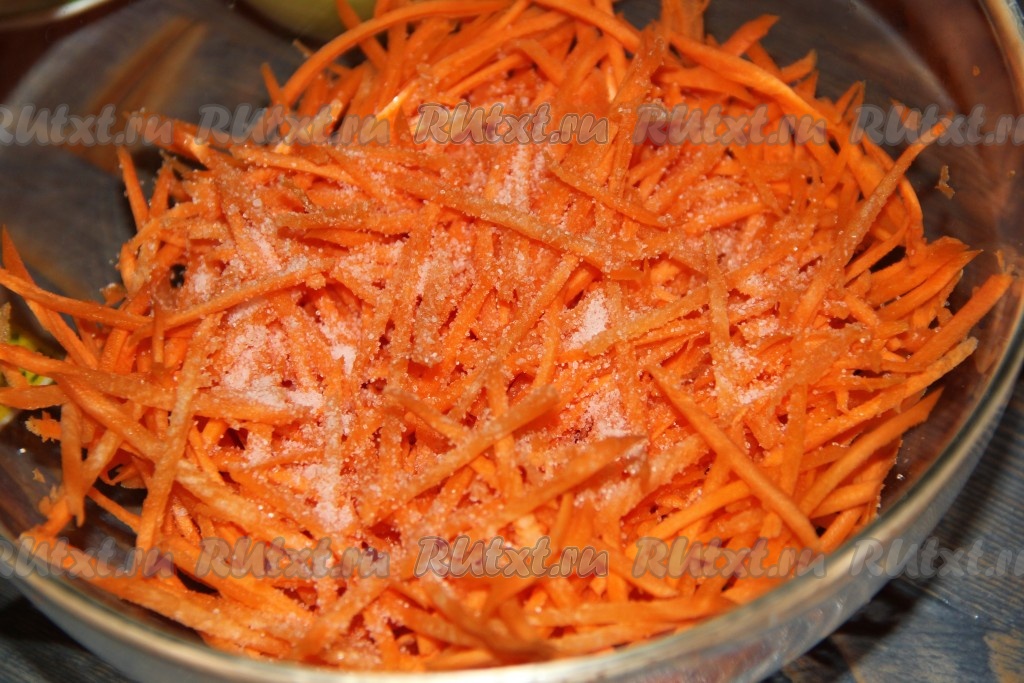 Морковь натереть на тёрке для корейской моркови, выложить в глубокую миску, добавить соль, перемешать и оставить на 20 минут.