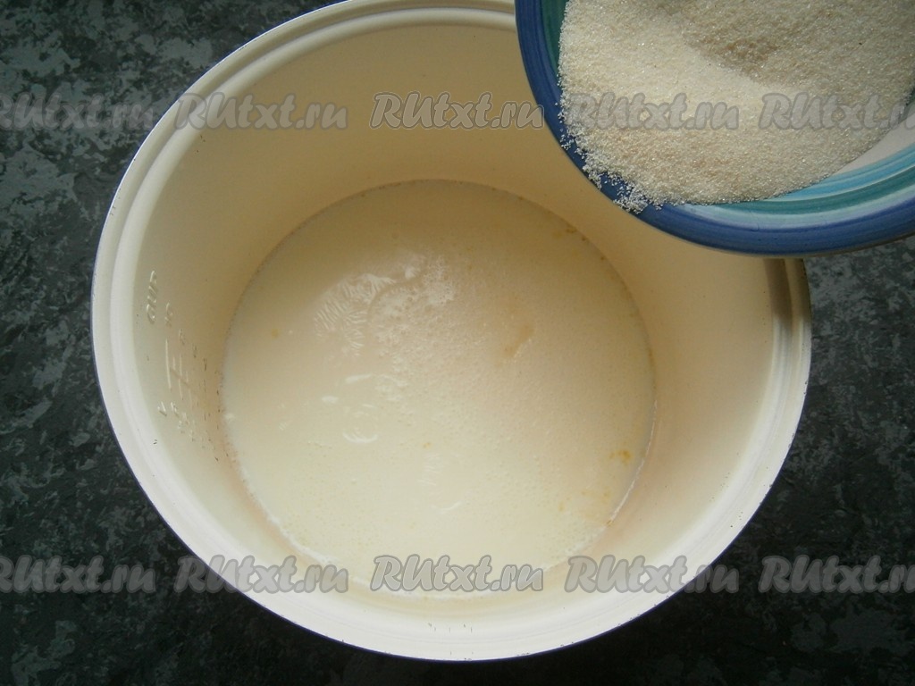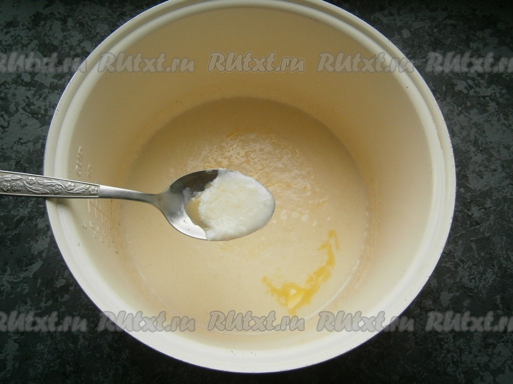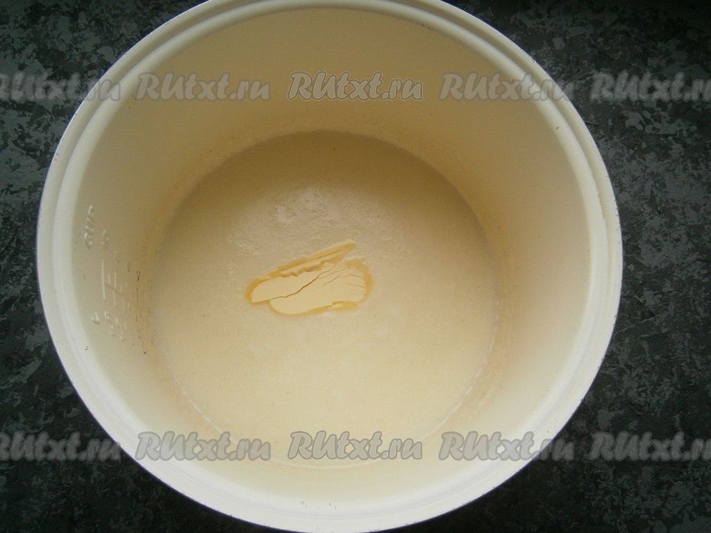 В чашу мультиварки влить молоко и воду, всыпать щепотку соли. На всякий случай, чтобы молоко не убежало в процессе готовки, смажьте стенки чаши по кругу сливочным маслом на 5 см выше молока.