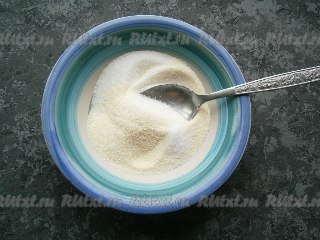Манную крупу смешать с сахаром и ванильным сахаром.