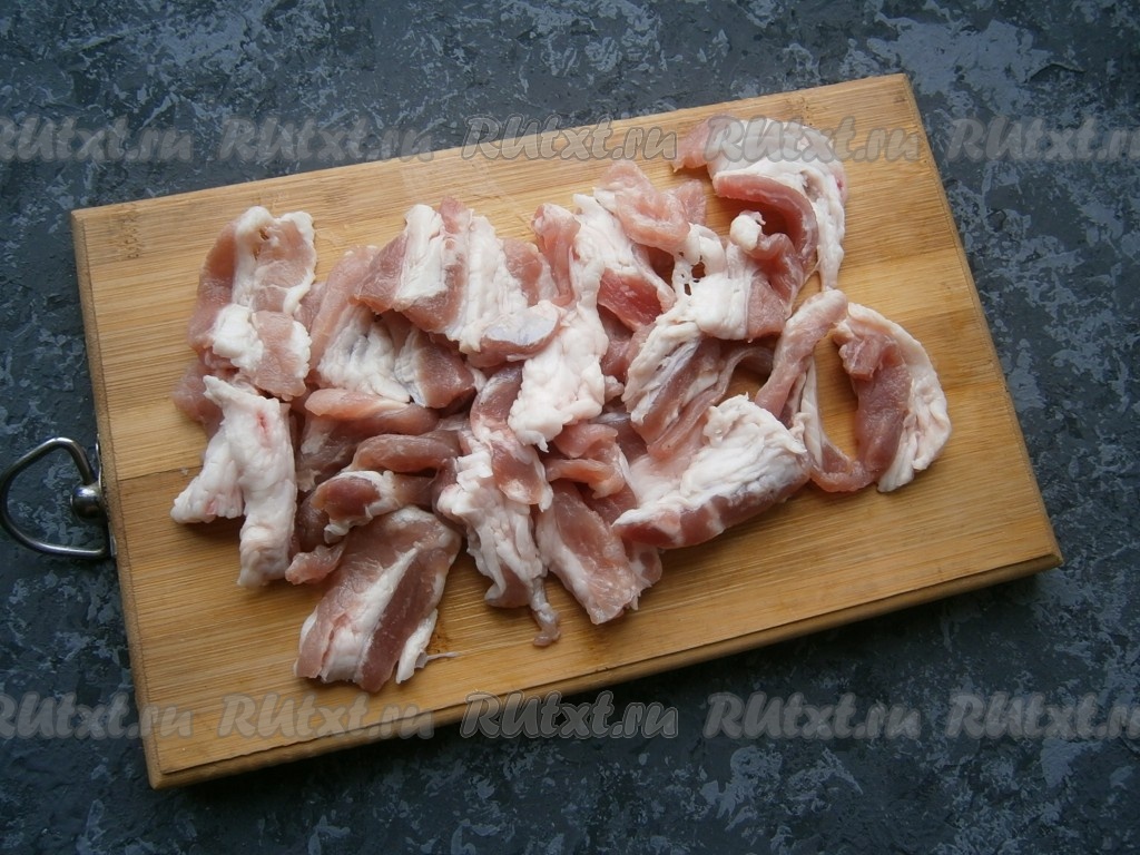 Разрезать каждую пластину бекона на 3-4 части шириной 3-4 см.