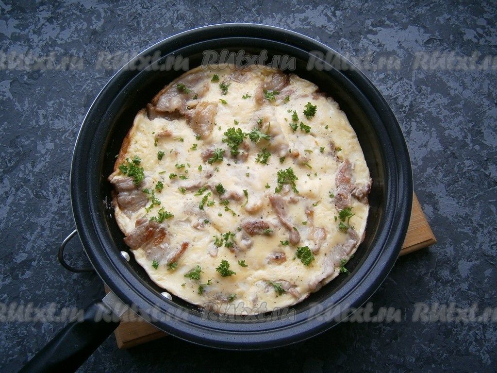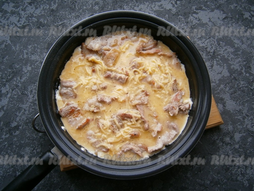 Залить бекон яично-сырной смесью, огонь сделать минимальным, сковороду накрыть крышкой.