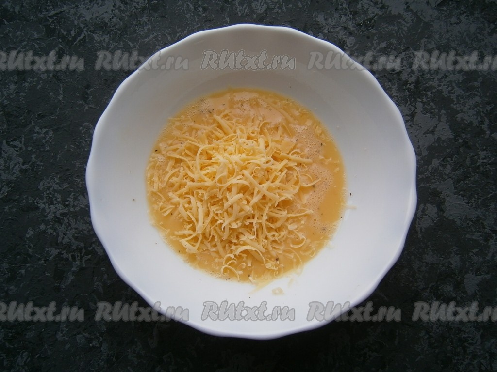 Сыр натереть на мелкой (или средней) терке и добавить в яичную смесь, перемешать.