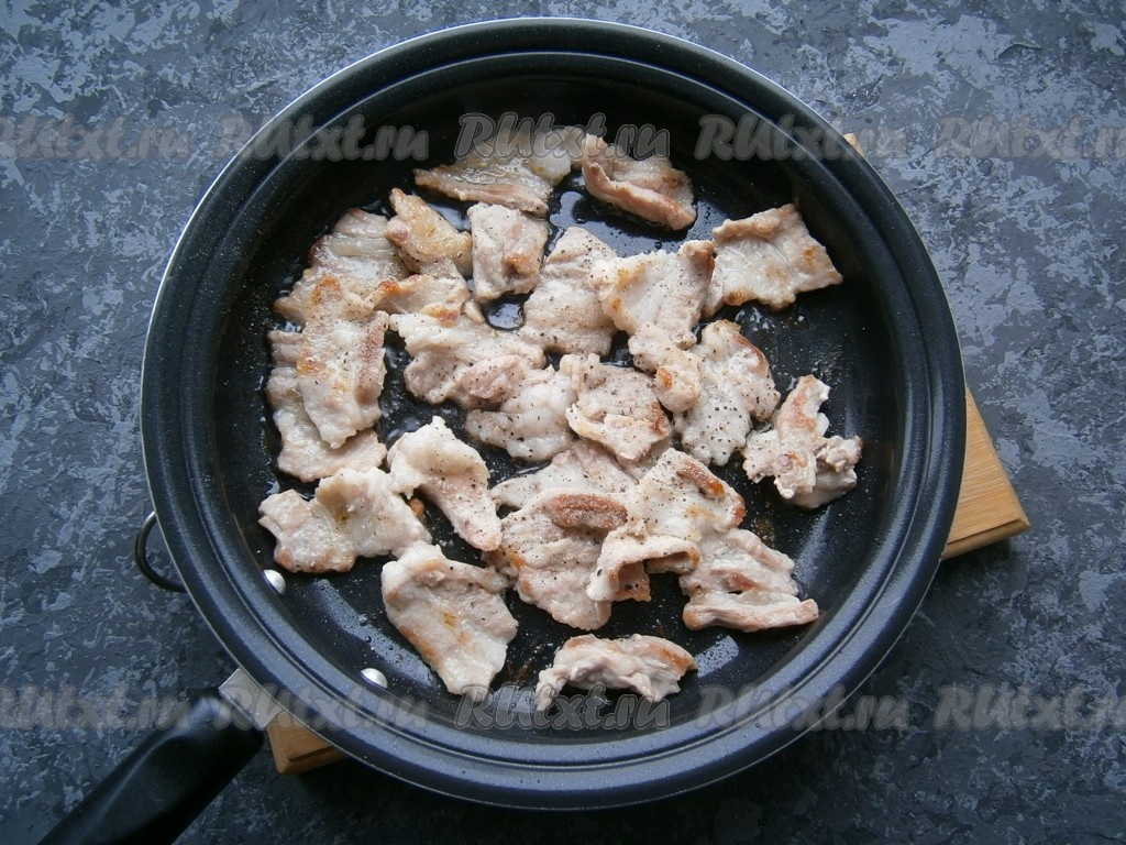 В разогретую сковороду выложить кусочки бекона в один слой. Посолить, поперчить, посыпать немного чесночным перцем. Обжарить бекон на среднем огне до румяности с двух сторон и выделения жира.