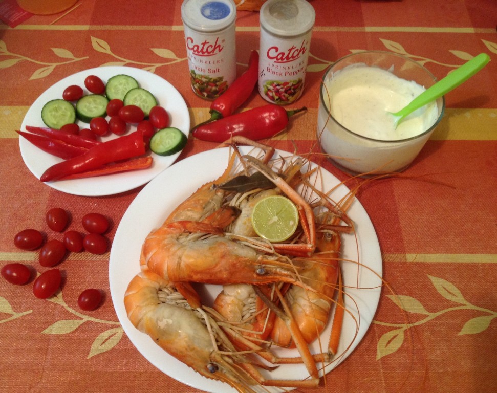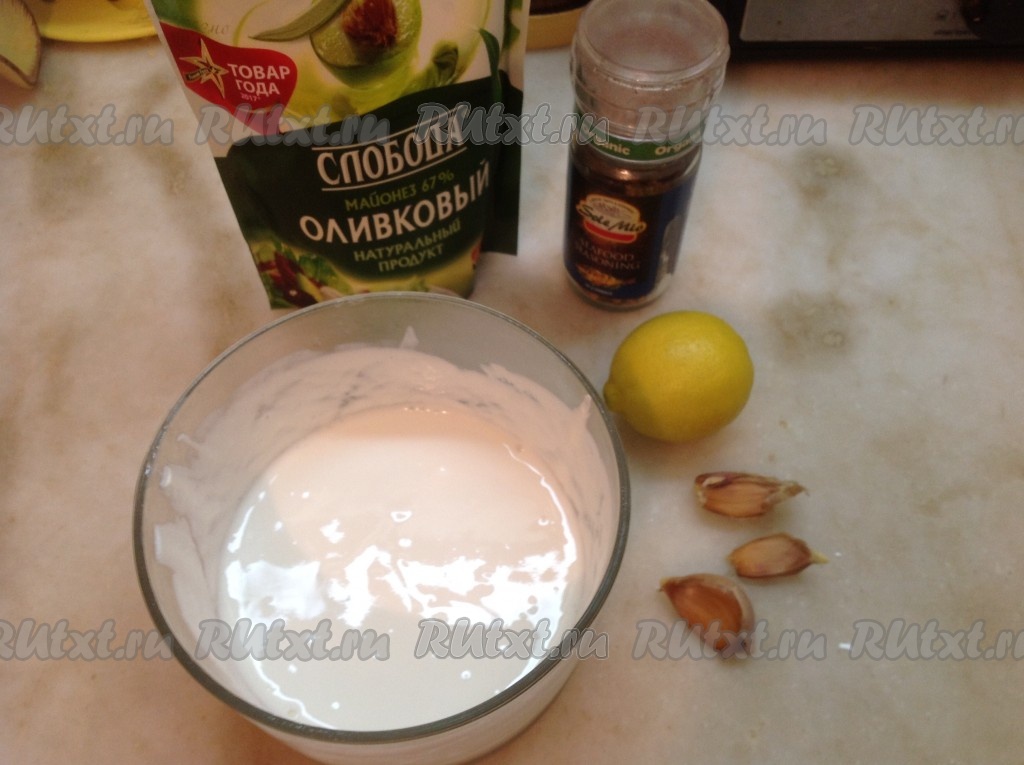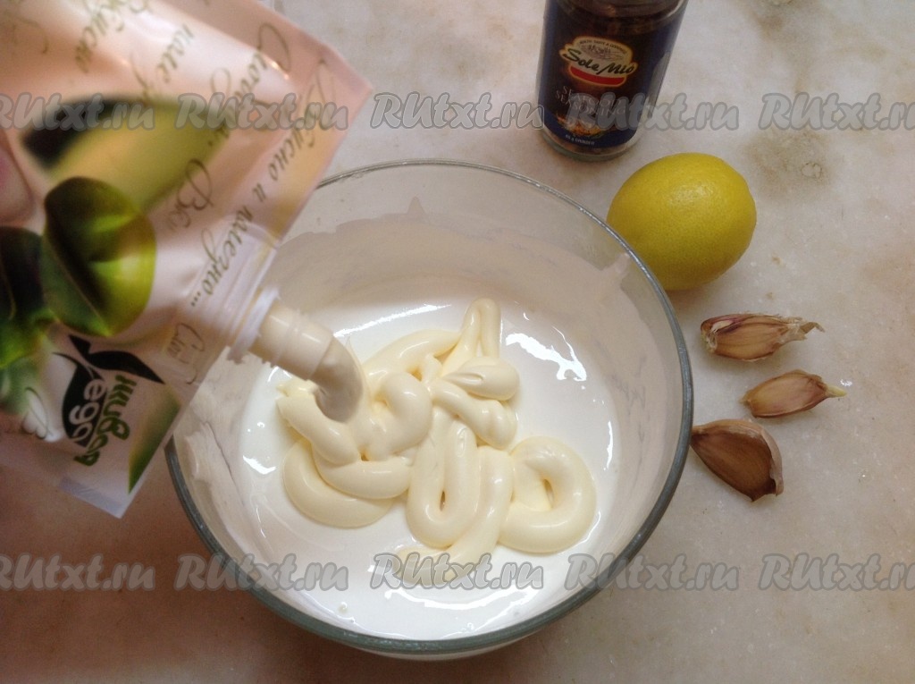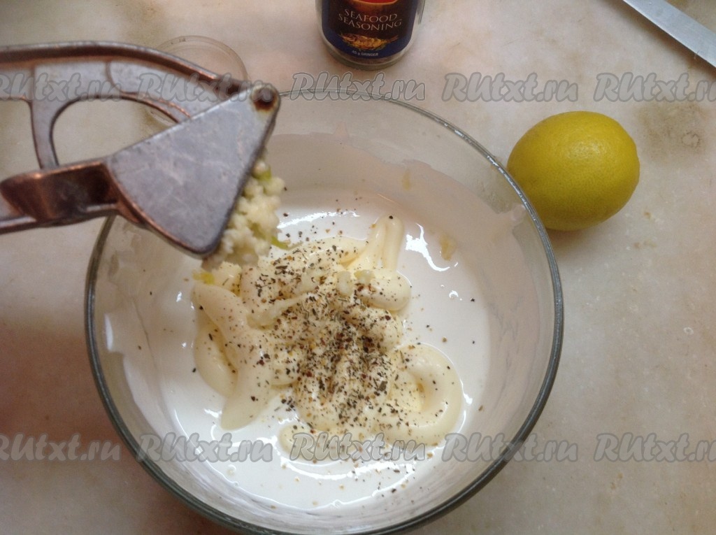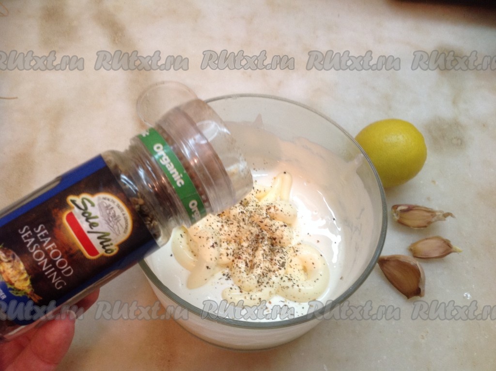 Добавляем в сметану майонез (по желанию), специи для морепродуктов, чеснок, пропущенный через пресс.