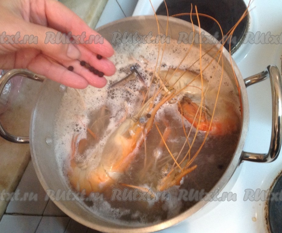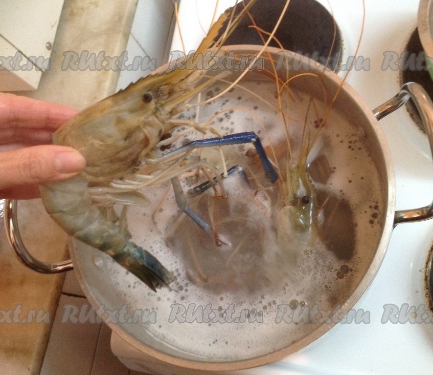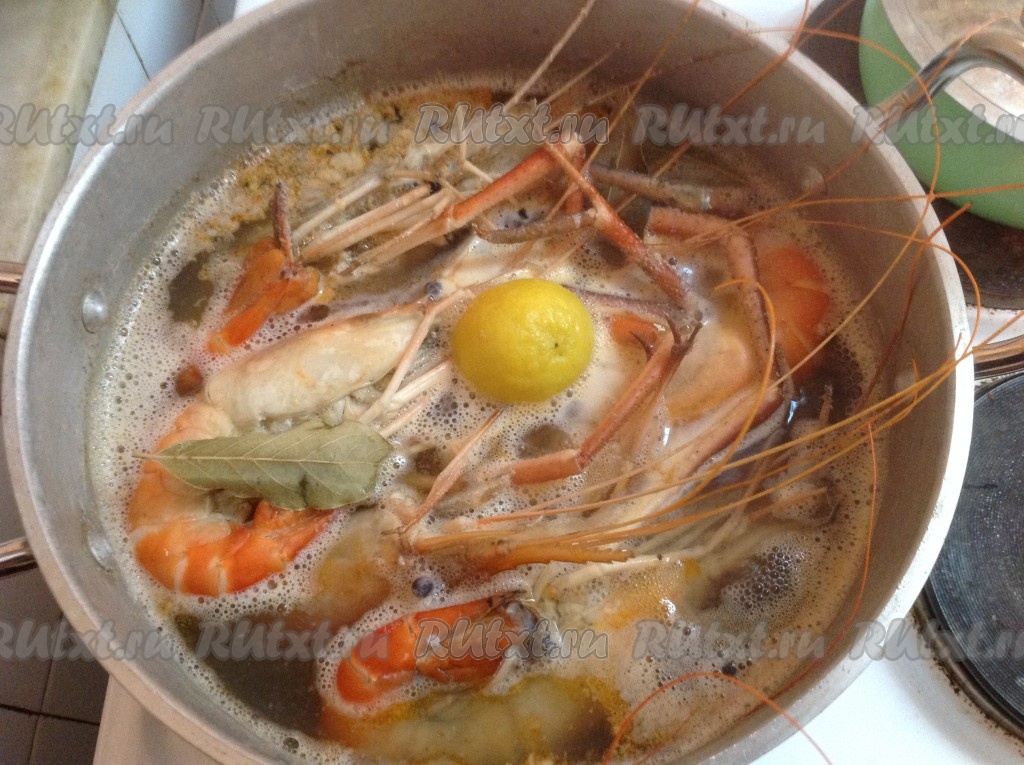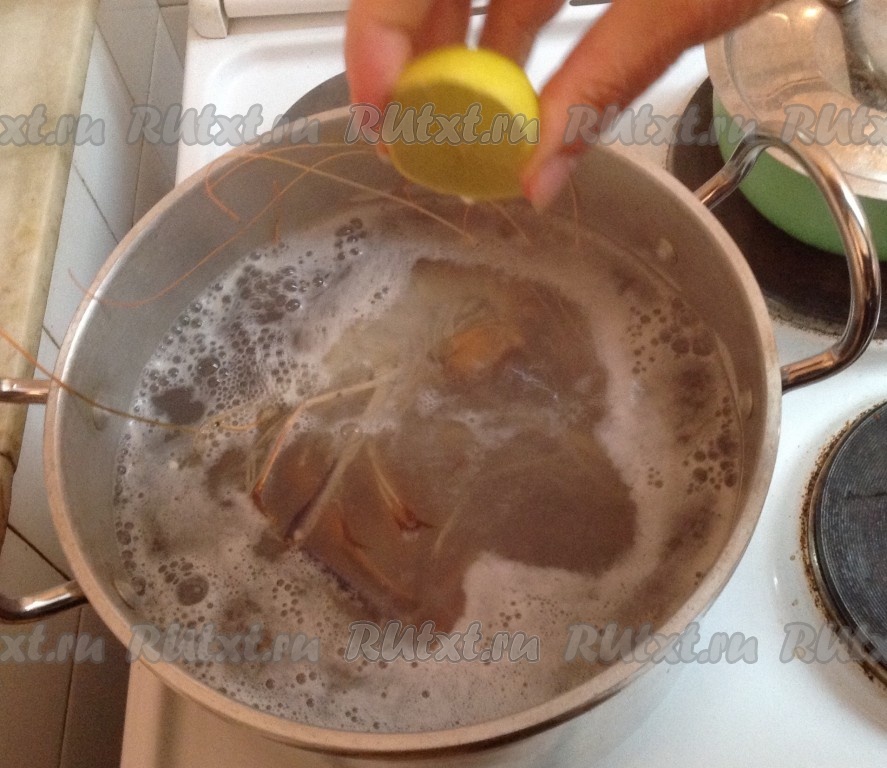 Тем временем вода в кастрюле закипела. Выжимаем в кипящую воду сок половинки лайма (или лимона) и опускаем в кипящую воду бэби лобстеров.