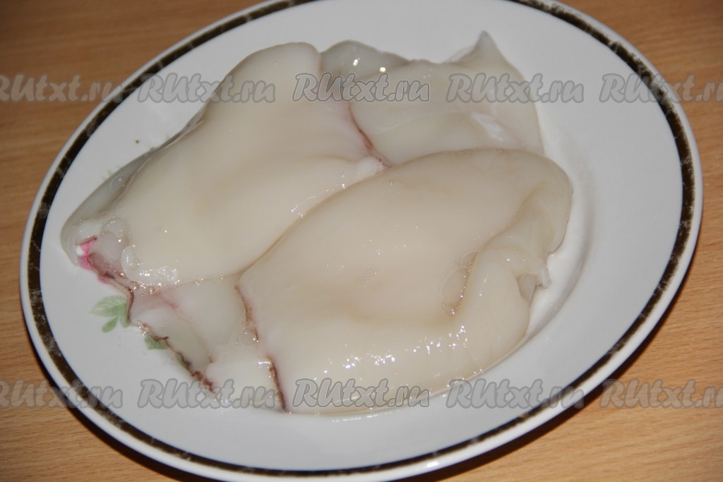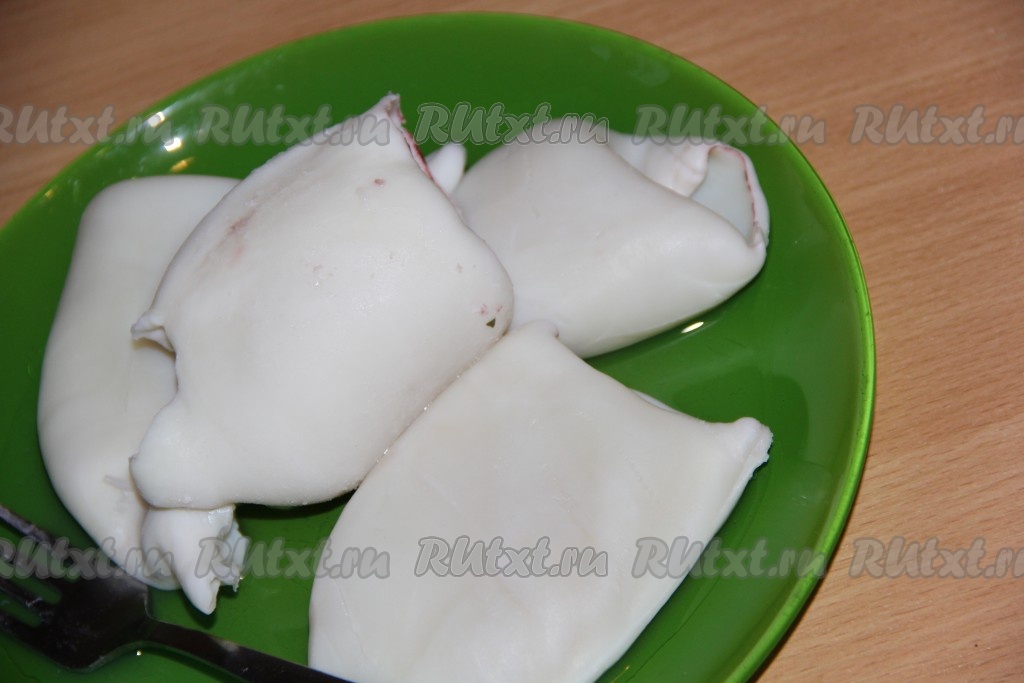 Для начала нужно промыть кальмаров под проточной водой и удалить плёнку.