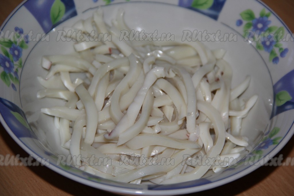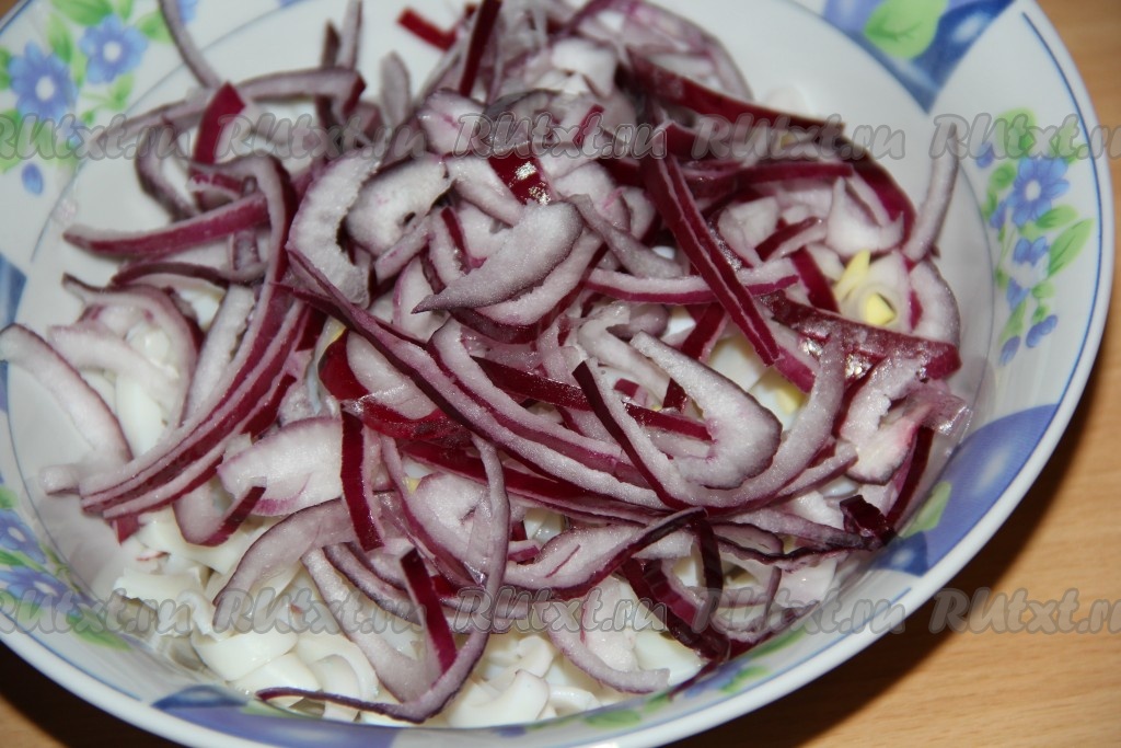 Лук очистить, нарезать на тонкие полукольца и выложить к кальмарам.