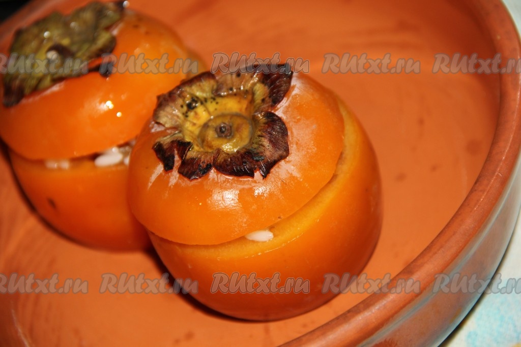 Накрыть начинку крышечкой из верхушки. Поставить фаршированную хурму в разогретую духовку и запекать при температуре 200 градусов, примерно, 15-20 минут.