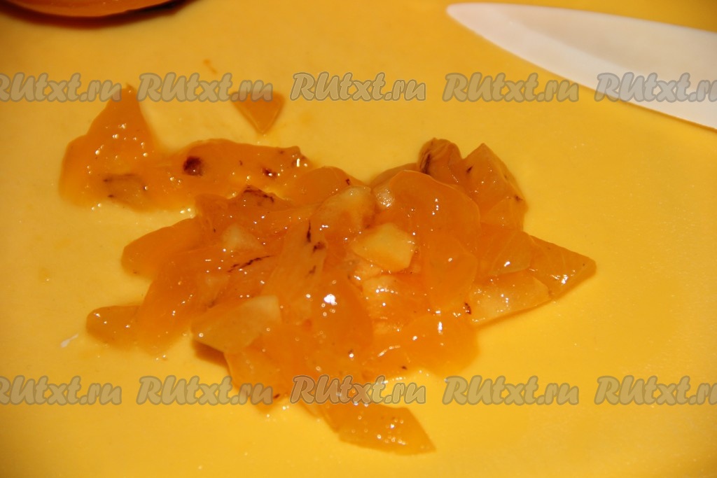 Мякоть хурмы нарезать на мелкие кусочки (или размять вилкой).