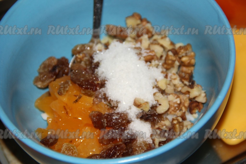 К получившейся массе добавить сахар, ванильный сахар и рубленные орехи (я порубила орехи ножом, можно натереть на крупной тёрке).