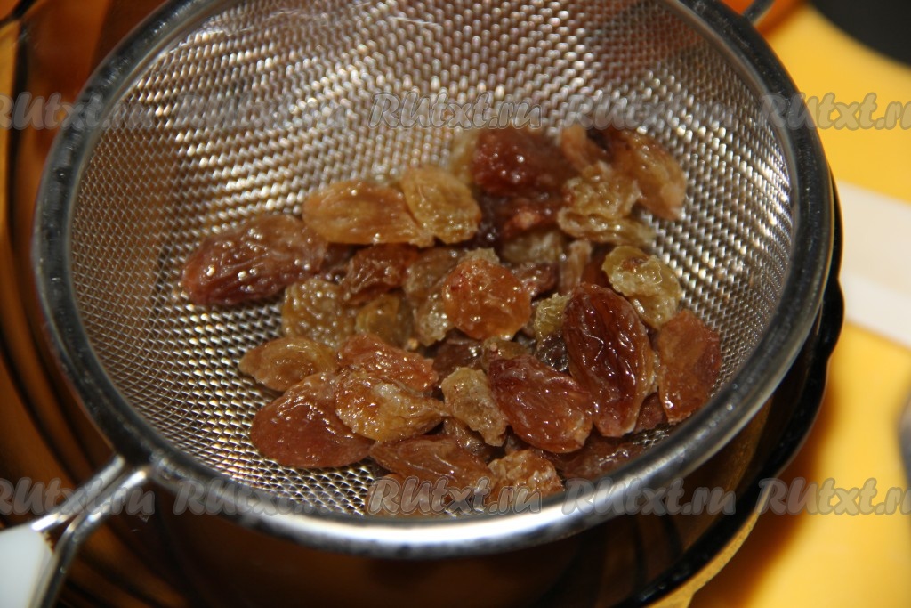 Для приготовления начинки изюм обдать кипятком и откинуть на дуршлаг.