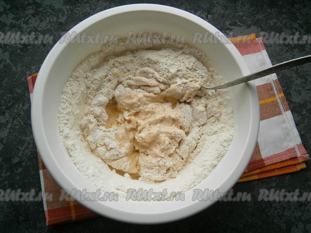 Добавить в мучную смесь опару, перемешать.