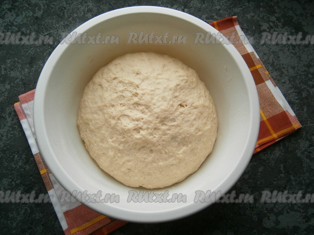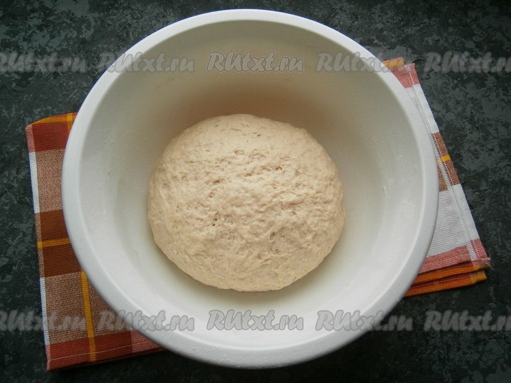 Частями добавляя оставшуюся просеянную муку и каждый раз тщательно вмешивая её, замесить мягкое, нежное, но хорошо держащее форму, плотное тесто. Тесто нужно хорошо вымесить в течение 7 минут. Затем собрать тесто в шар, поместить его в миску, смазанную растительным маслом. Миску накрыть полотенцем (или затянуть пищевой плёнкой), чтобы тесто не заветривалось, и оставить в тепле на 1 час.