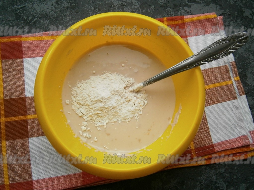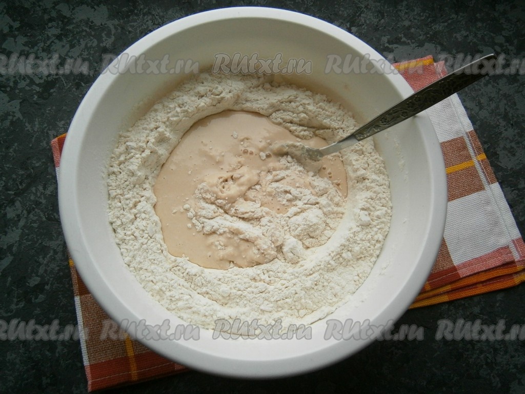 Также всыпать 2 столовых ложки муки от общего количества, перемешать, накрыть плёнкой и оставить опару в тепле на 20 минут.