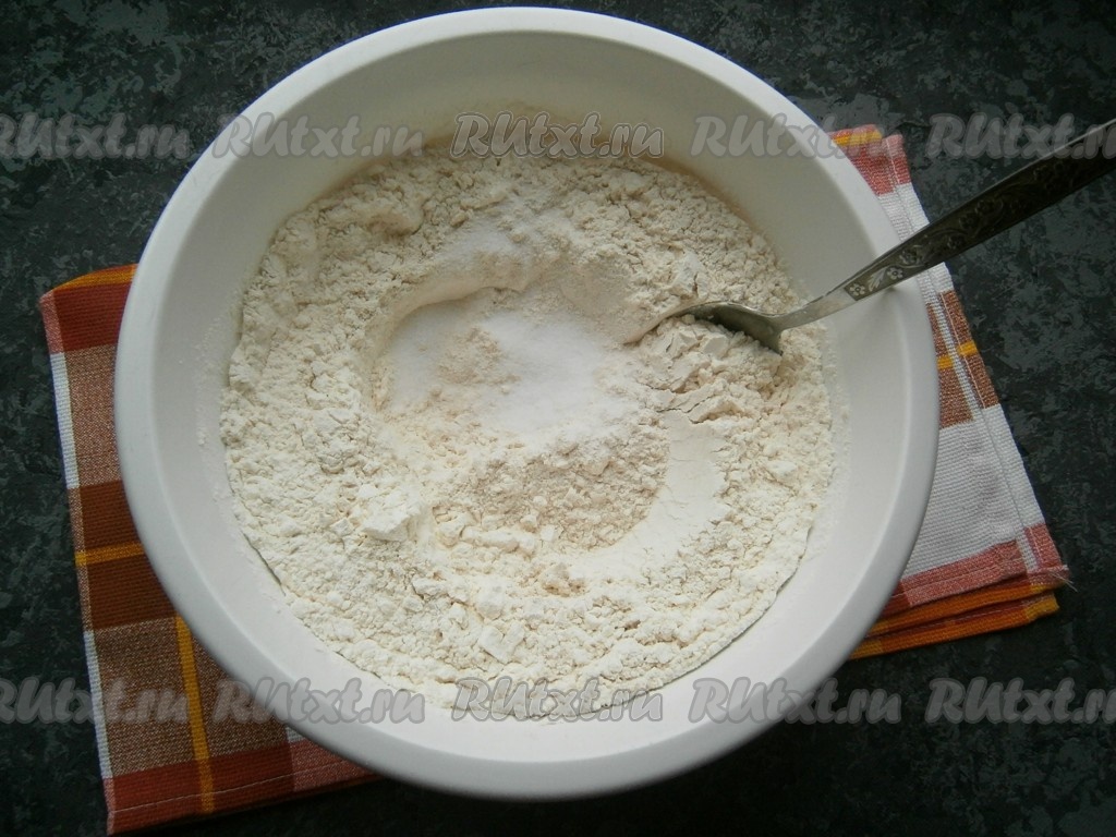 В отдельную глубокую миску всыпать 300 грамм муки, соль, перемешать.
