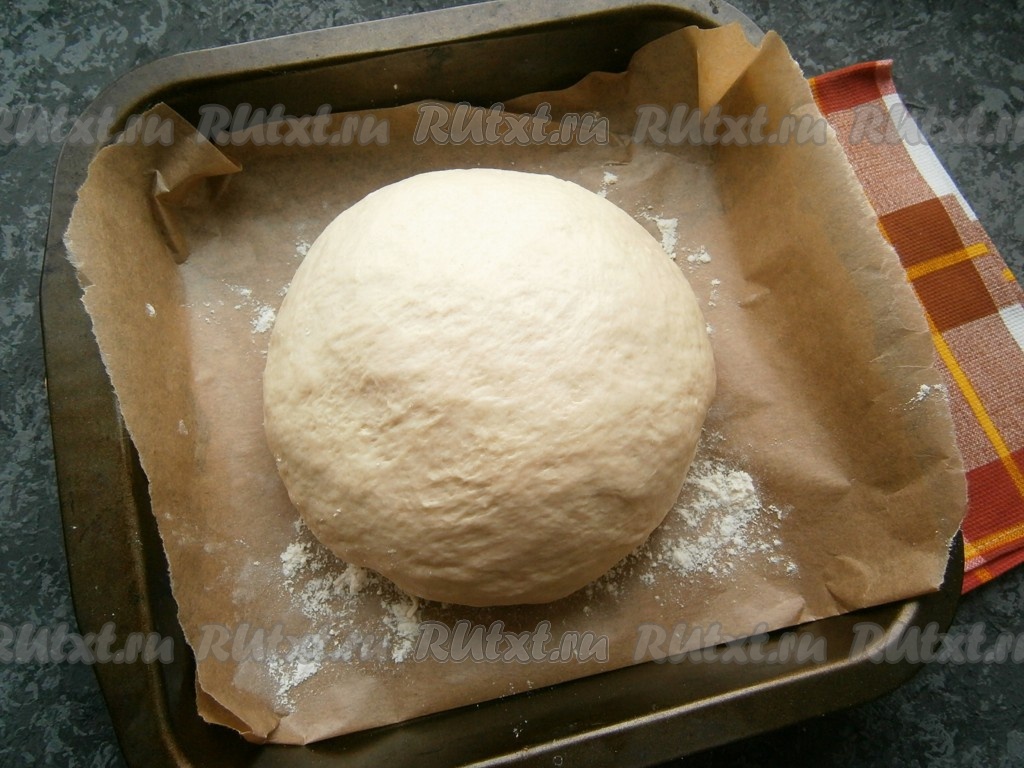 Далее тесто обмять (без муки, смазывая руки растительным маслом), сформировать шар и поместить его на противень, застеленный пергаментом и чуть присыпанный мукой.