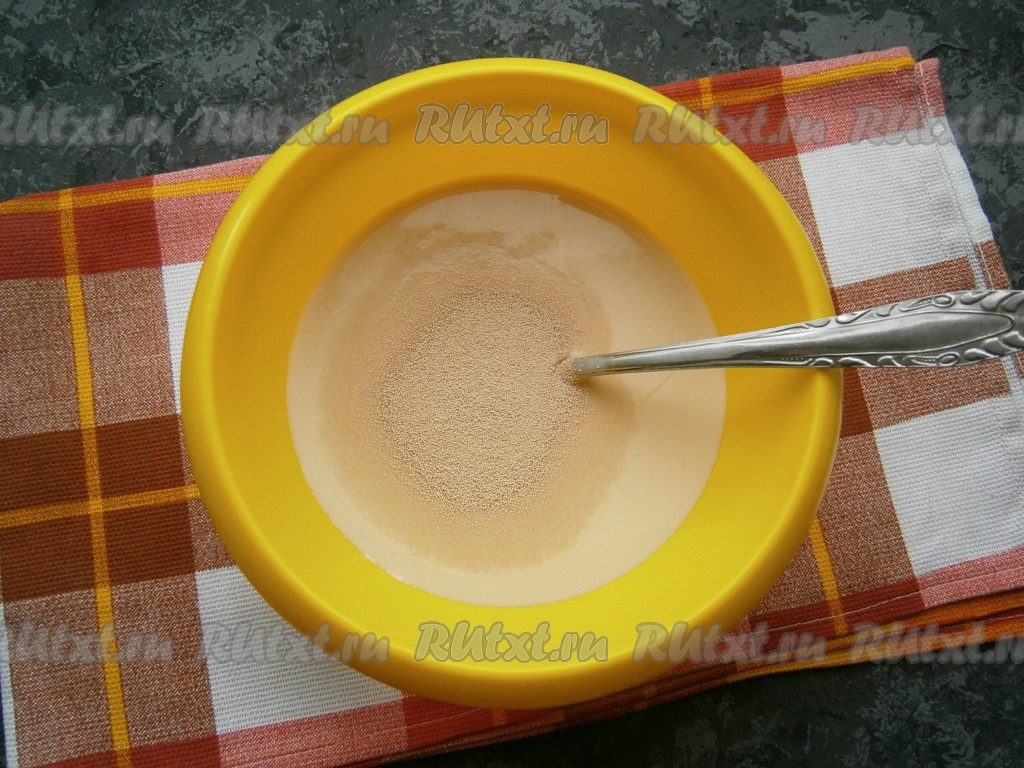 Ряженку можно взять любой жирности. Я купила жирностью 4%. В достаточно объёмную миску влить чуть тёплую ряженку (я её подогрела буквально в течение 20 секунд в микроволновке), всыпать дрожжи, добавить сахар.