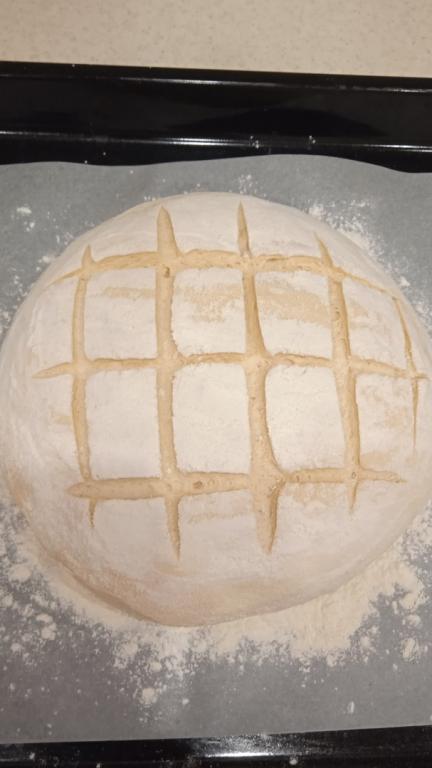 Прикрыть тесто плёнкой (или полотенцем) и оставить в тёплом месте на 25-30 минут, после чего сделать сверху несколько надрезов.
