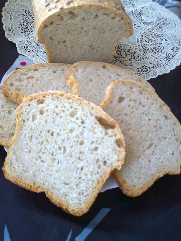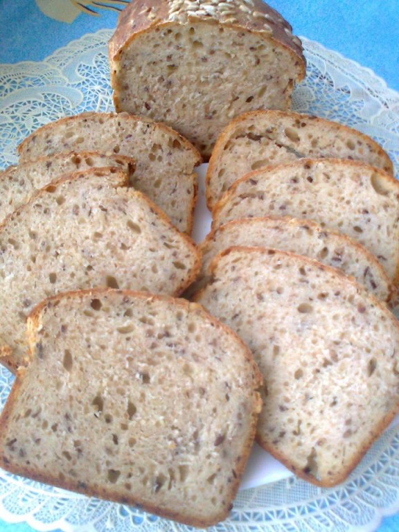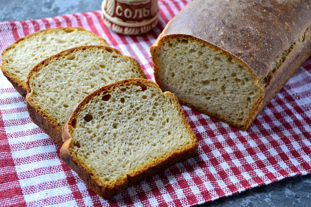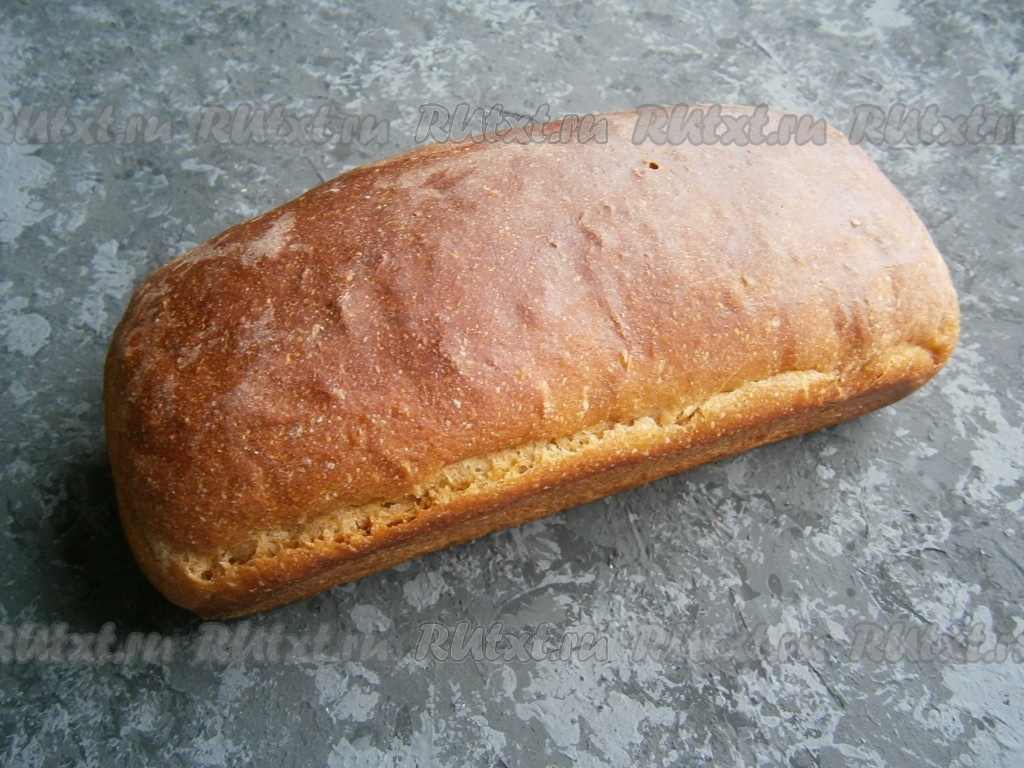 Необыкновенно вкусный, ароматный и полезный пшеничный хлеб, приготовленный на ржаной закваске, нарезав на ломти, подать к столу.