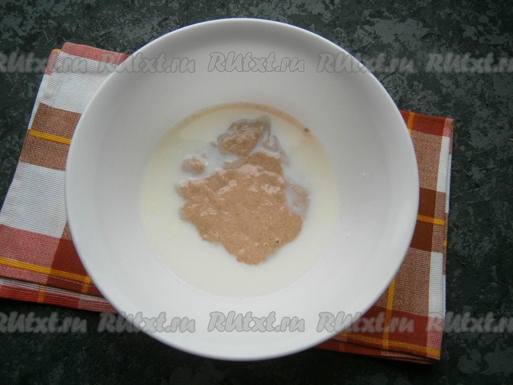 В теплое молоко добавить 150 грамм активной ржаной закваски. Если ваша закваска находилась в холодильнике, ее нужно взять 50 грамм, добавить 50 грамм ржаной муки и 50 мл теплой воды, перемешать и оставить на 3-4 часа, закваска должна "ожить", то есть начать интенсивное брожение, после этого добавить ее в молоко.