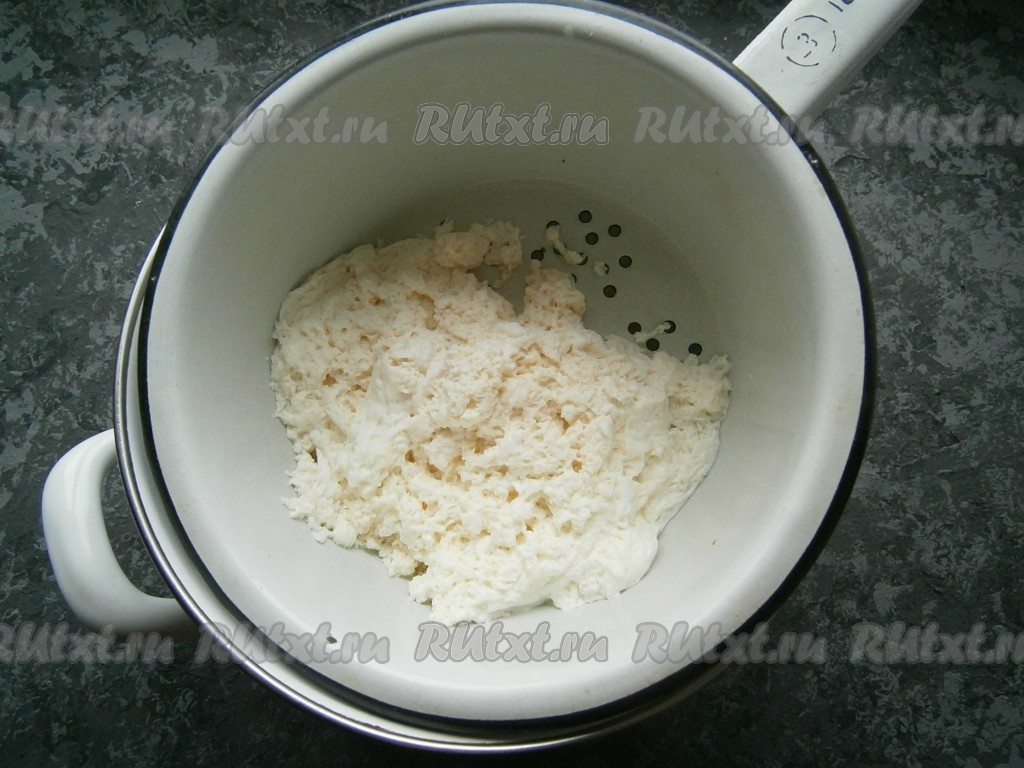 Откинуть готовый творог на дуршлаг с небольшими дырочками, ложкой отжать от сыворотки. Если нужен творог посуше, можете поместить его в марлю, сложенную в 2-3 раза, и подвесить. Дать творогу полностью остыть.