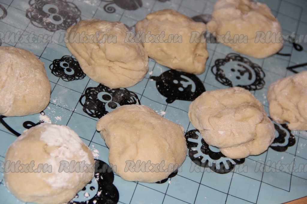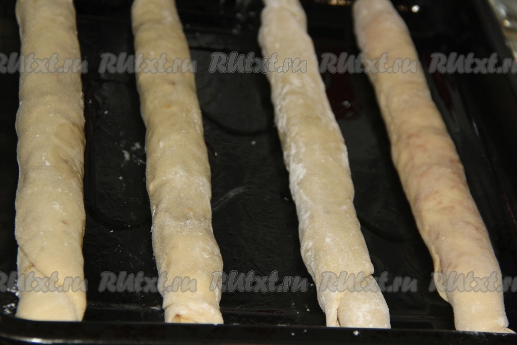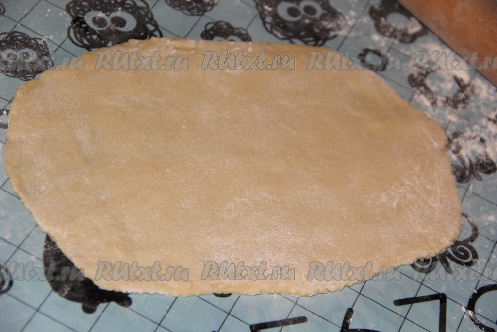 На столе, припыленном мукой, каждую часть теста раскатать в прямоугольник.