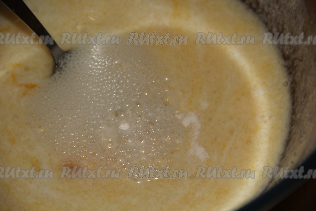 Перемешать массу. Далее добавить гашеную уксусом соду и перемешать.