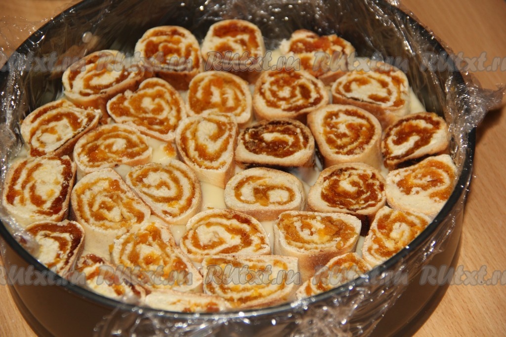 Затем выложить в один слой рулетики с курагой. Выкладывать не слишком плотно.