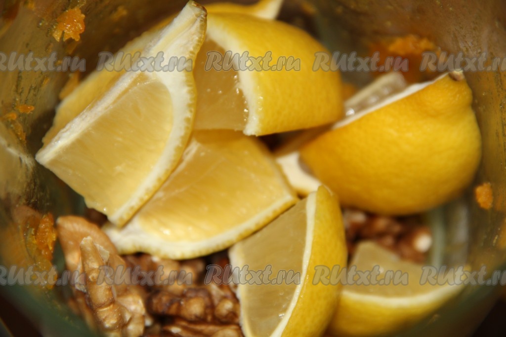 Затем приготовить вторую начинку. В чашу блендера выложить орехи и лимон, нарезанный на крупные дольки вместе с кожурой.