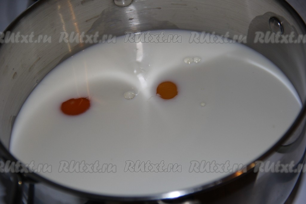 Пока выпекаются рулеты, приготовить заварной крем для торта: в кастрюлю влить молоко, добавить сахар, ванильный сахар и яйца.