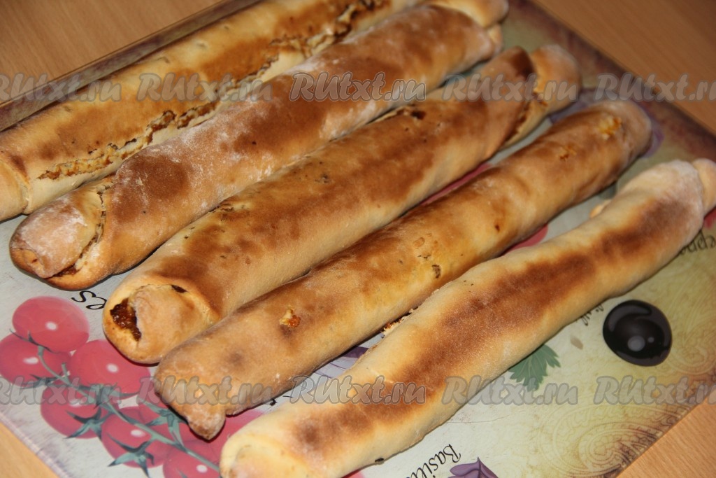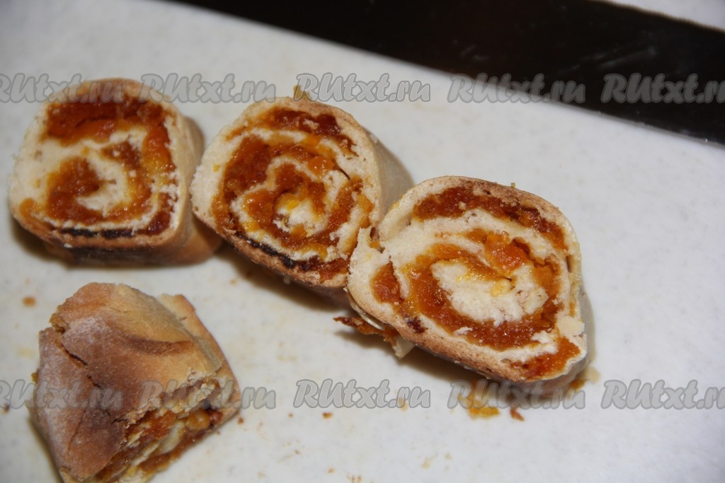 Свернуть тесто с начинкой в плотный рулет. У нас получится 4 рулета с курагой и 4 рулета с изюмом и орехами.