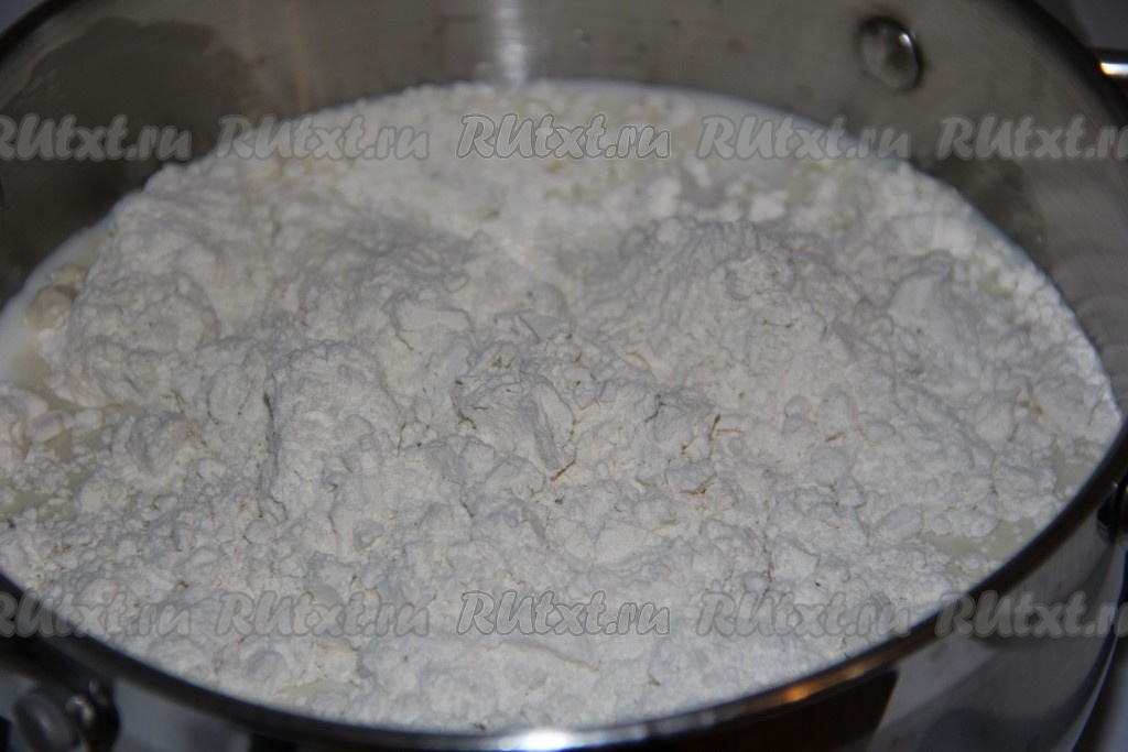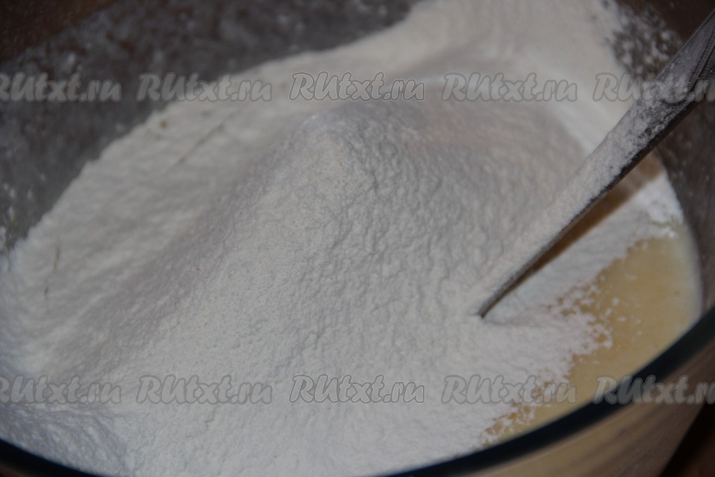 Затем всыпать 300 грамм просеянной муки и перемешать ложкой.