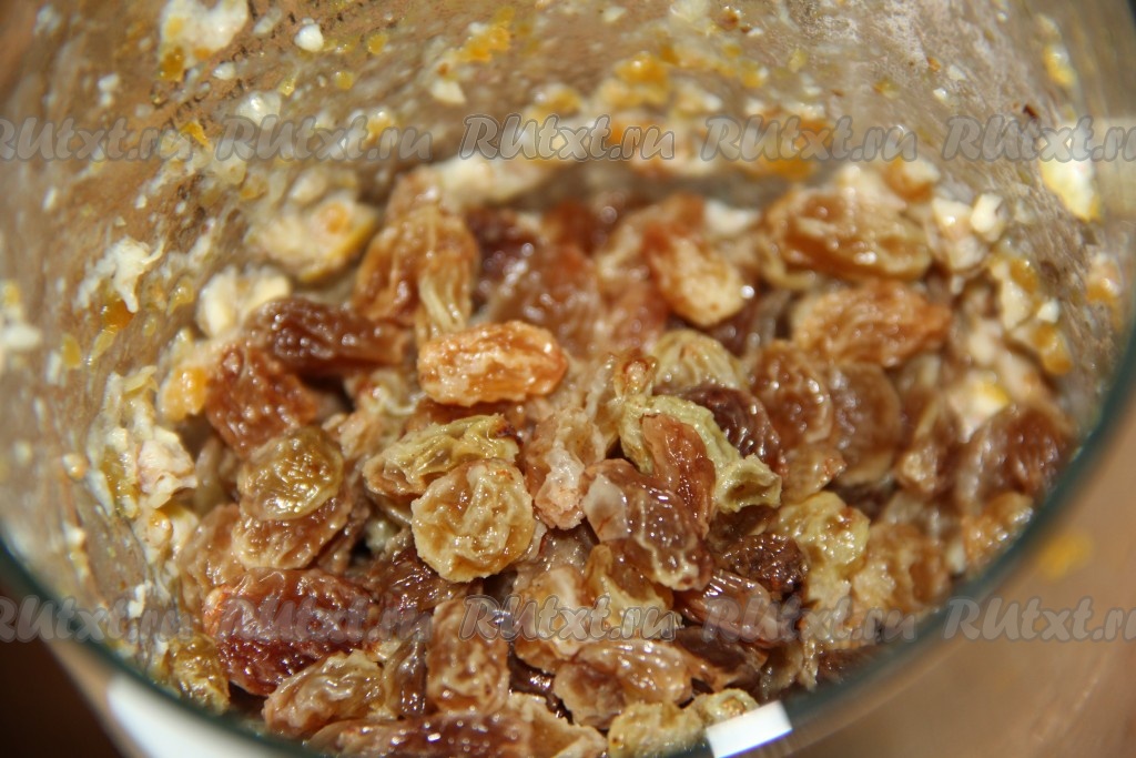 Пробить орехи с лимоном до однородного состояния, а затем добавить изюм и ещё раз пробить.