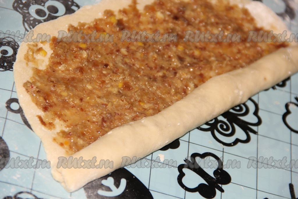 Начинку разделить на равные части. Смазать тесто начинкой, оставляя края раскатанного теста чистыми (как на фото).