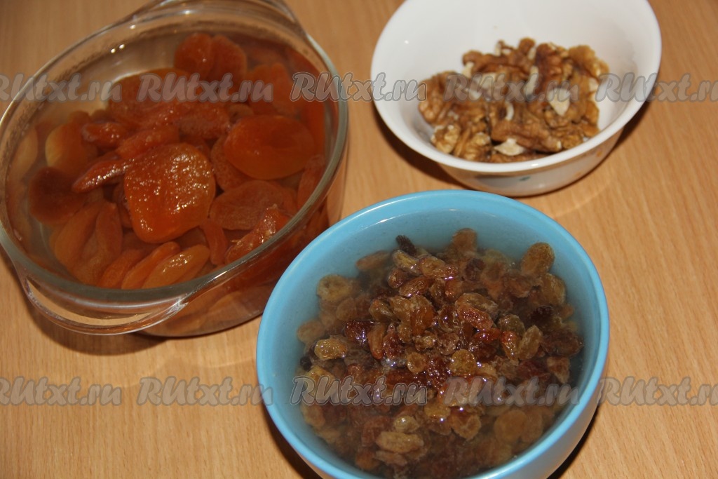 Пока тесто отдыхает, приготовить начинку. Орехи можно взять любые. Лимон хорошо вымыть. Изюм и курагу залить кипятком на пару минут в разных тарелках.