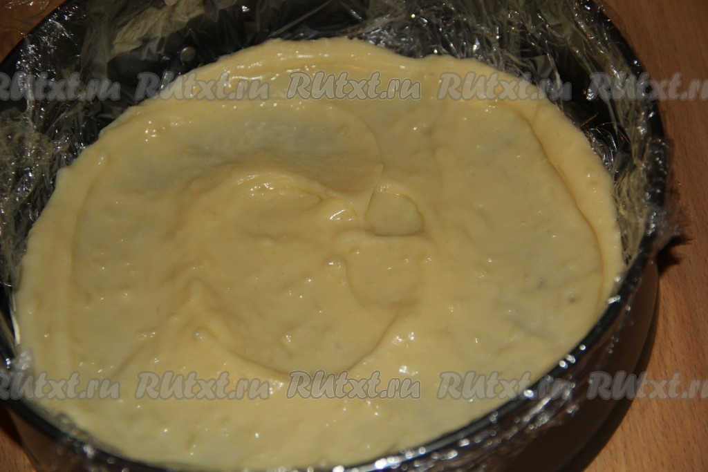Разъёмную форму (у меня форма диаметром 28 см) застелить пищевой плёнкой. На дно формы выложить крем (примерно 4-5 столовых ложек).