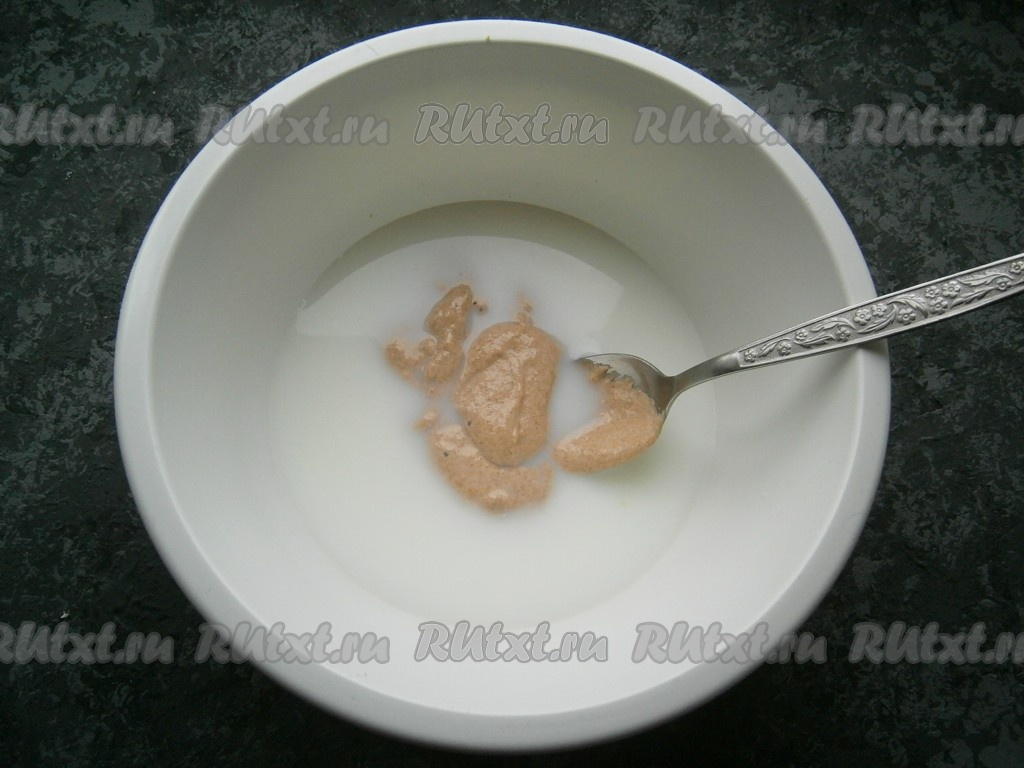 Воду смешать с молоком, добавить активную закваску, тщательно перемешать. Активная закваска - это та, которая находится в тепле и активно бродит. Если закваска у вас хранилась в холодильнике, её нужно обязательно освежить, для этого отложите в миску 20 грамм холодной закваски, влейте 20 миллилитров тёплой воды, перемешайте, затем всыпьте 20 грамм ржаной муки, перемешайте и оставьте закваску в тёплом месте часа на 3-4, в ней должно начаться активное брожение, появится много пузырьков, закваска увеличится в размерах в 2-3 раза - вот 50 грамм этой закваски уже и добавляйте в смесь воды и молока.
