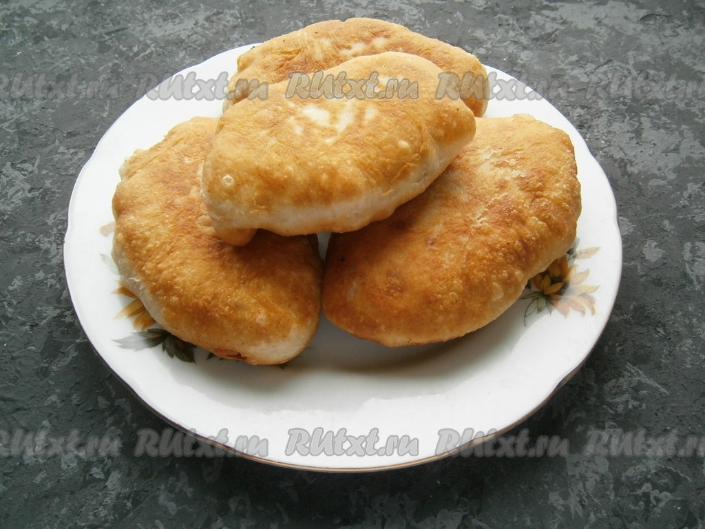 Жарить пирожки из такого теста нужно на небольшом огне, прикрывая сковороду крышкой. В разломе видно, что пирожки отлично прожарены.