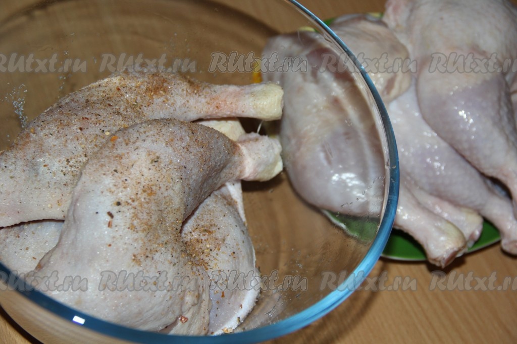 Очищенные зубчики чеснока натереть на мелкой терке (или пропустить через чеснокодавилку). Каждый окорочок хорошо натереть солью, специями и чесноком.