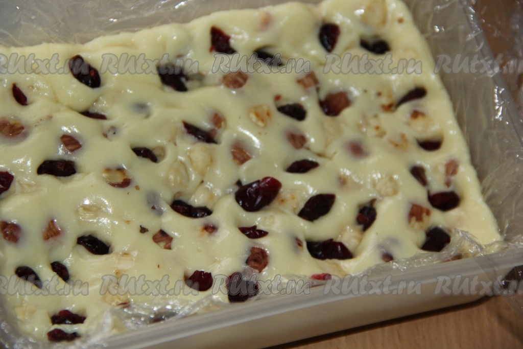 Накрыть массу плёнкой и выровнять поверхность. Накрыть контейнер крышкой и убрать в холодильник на ночь. Затем достать застывшую массу и освободить от плёнки.