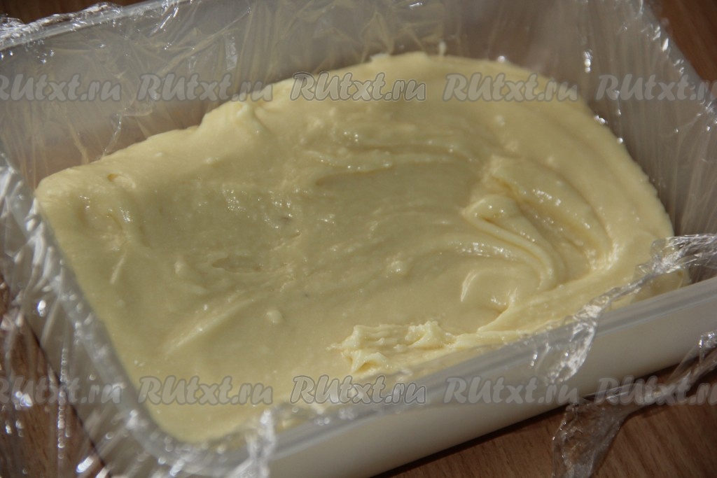 Пластиковый контейнер застелить пищевой плёнкой. Выложить массу в контейнер и равномерно распределить.