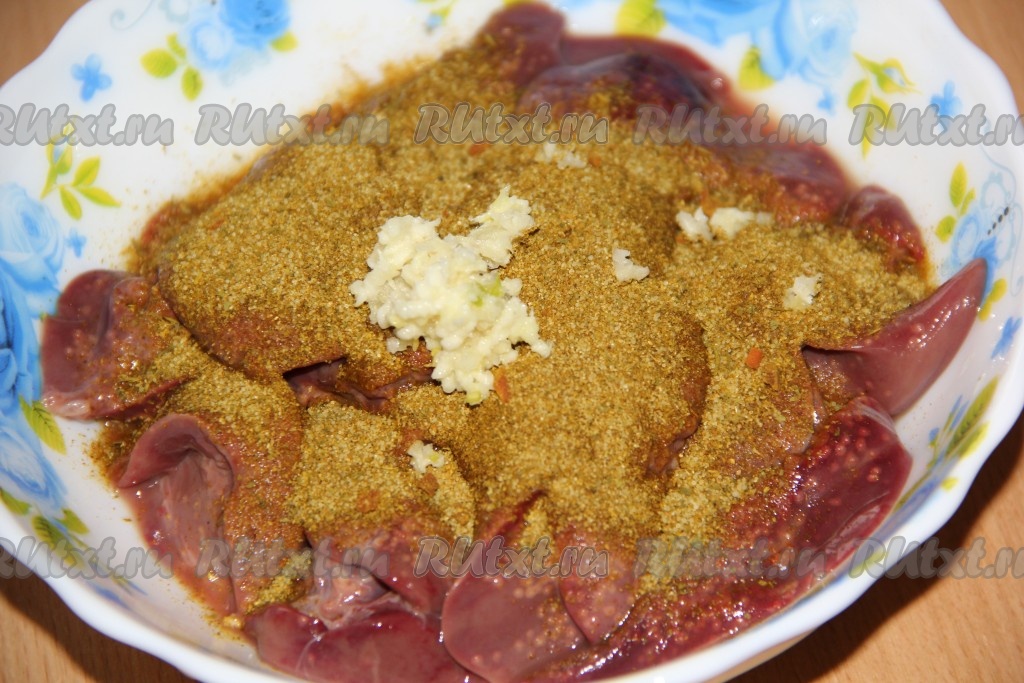 Добавить к печени хмели-сунели, очищенный и пропущенный через пресс чеснок, перемешать.