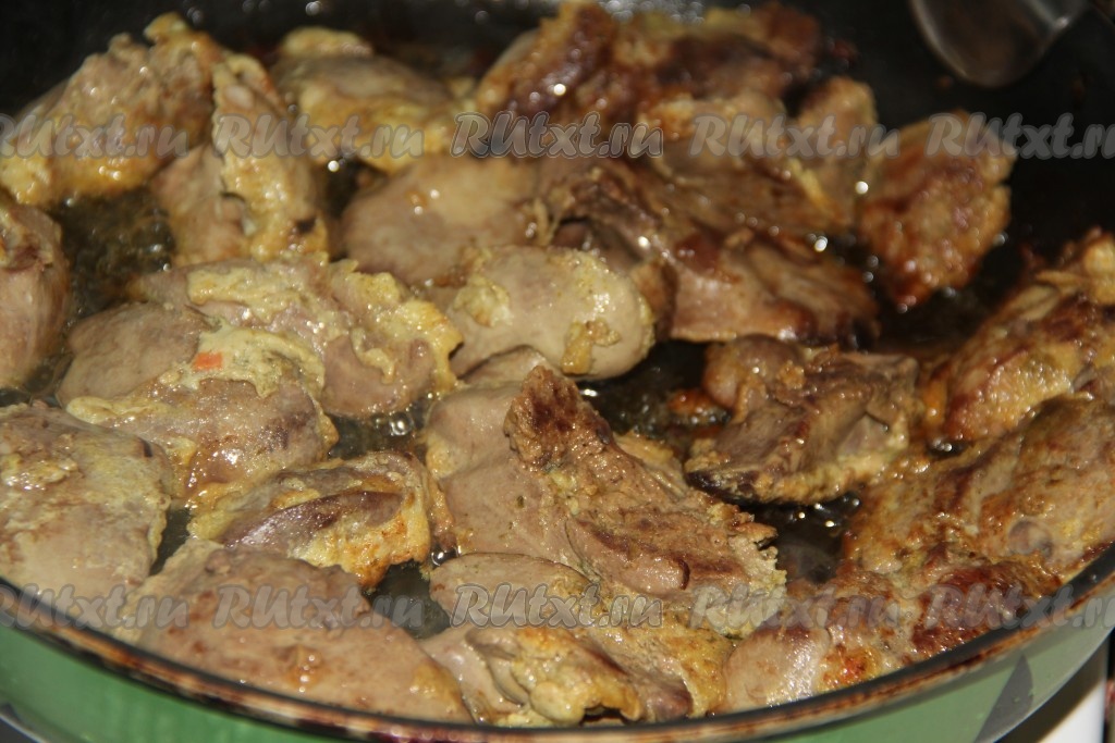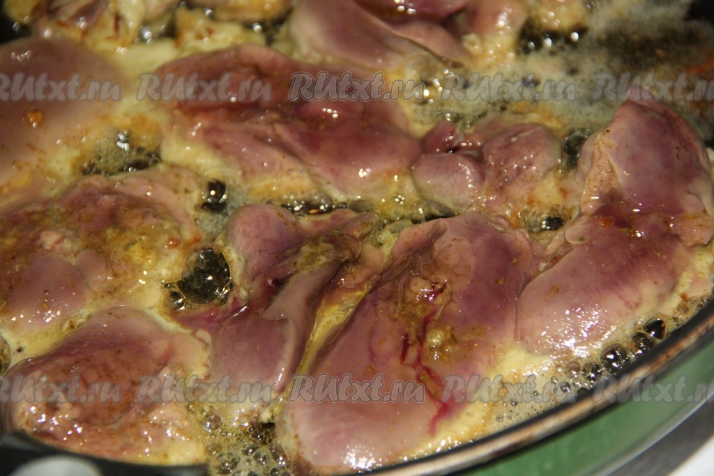Жарить куриную печень по 2-3 минуты с каждой стороны на среднем огне. Если будете жарить свиную или говяжью печень, то время жарки необходимо увеличить. Готовность жареной печенки можно определить ножом, разрезав кусочек. Если разрез без алых, кровяных вкраплений, то печень готова. Немаловажно и не передержать печень на сковороде, иначе она приобретет "резиновый" вкус.
