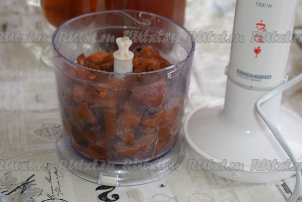 Отвар (он получается очень вкусным и насыщенным) можно выпить. А яблоки отожмем от жидкости, из них мы приготовим начинку для наших пирожков. Половину вареных яблок отправляем прокрутиться в блендер.