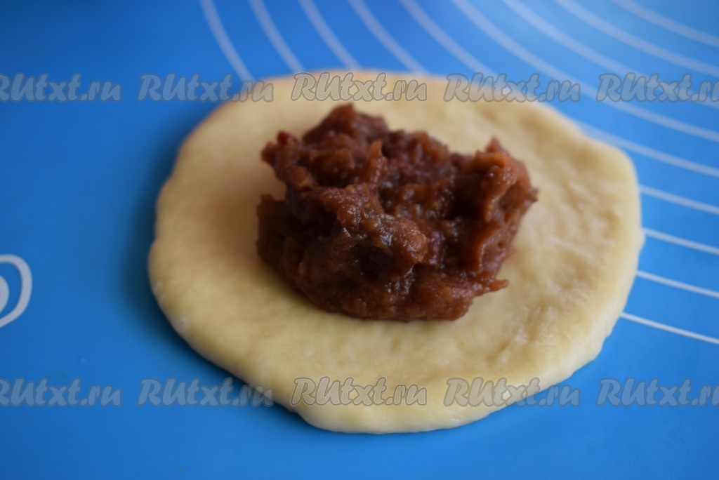На середину кружочка кладем 1 столовую ложку с горкой начинки.