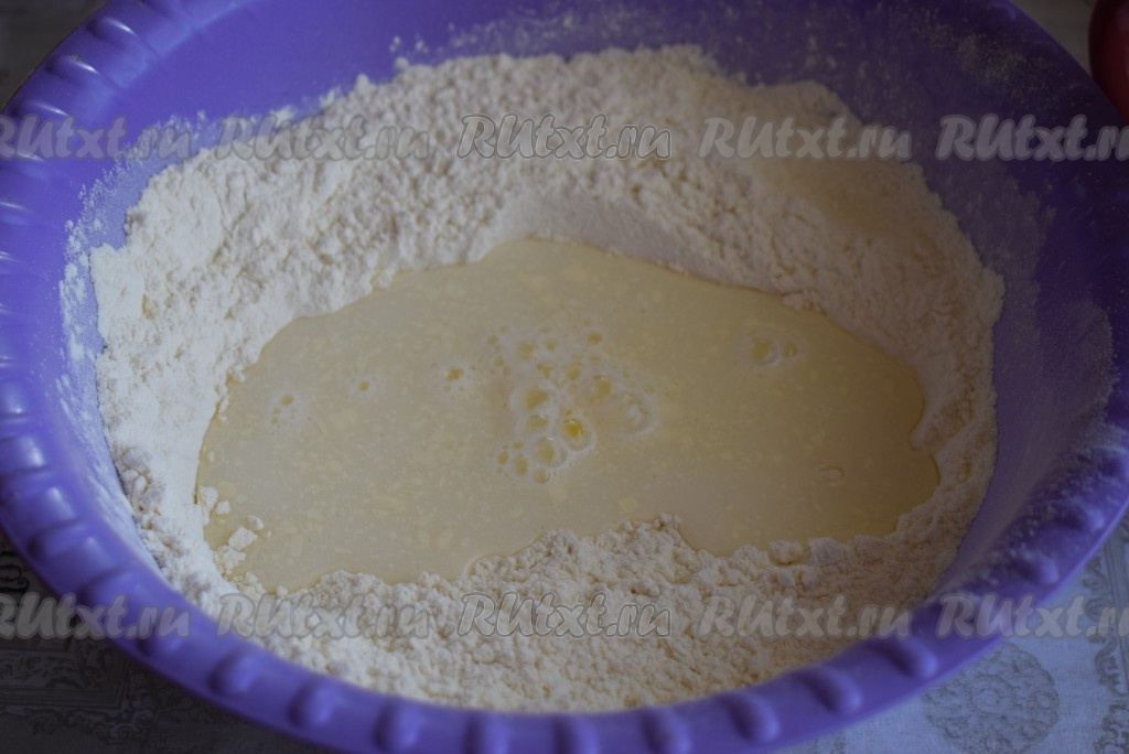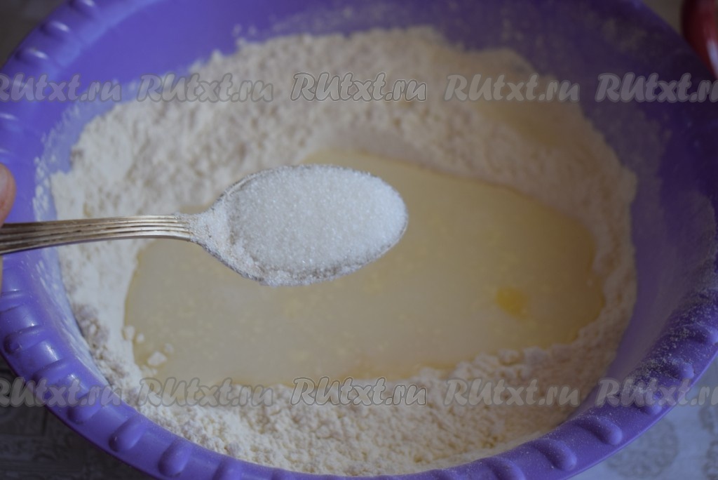 Затем к муке, воде и сметане добавим растительное масло и сахар, перемешаем.