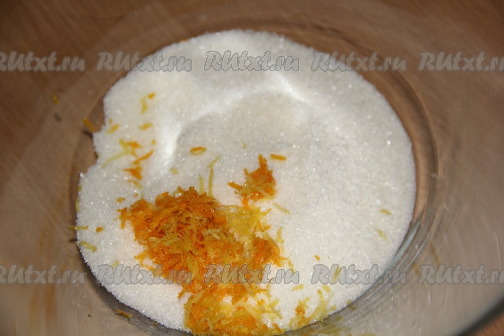 Лимон и апельсин тщательно вымыть и обсушить. Снять с апельсина и лимона цедру. В большой миске соединить сахар и цедру. Хорошо перетереть сахар с цедрой (можно это сделать с помощью вилки), чтобы цедра отдала свой аромат сахару.
