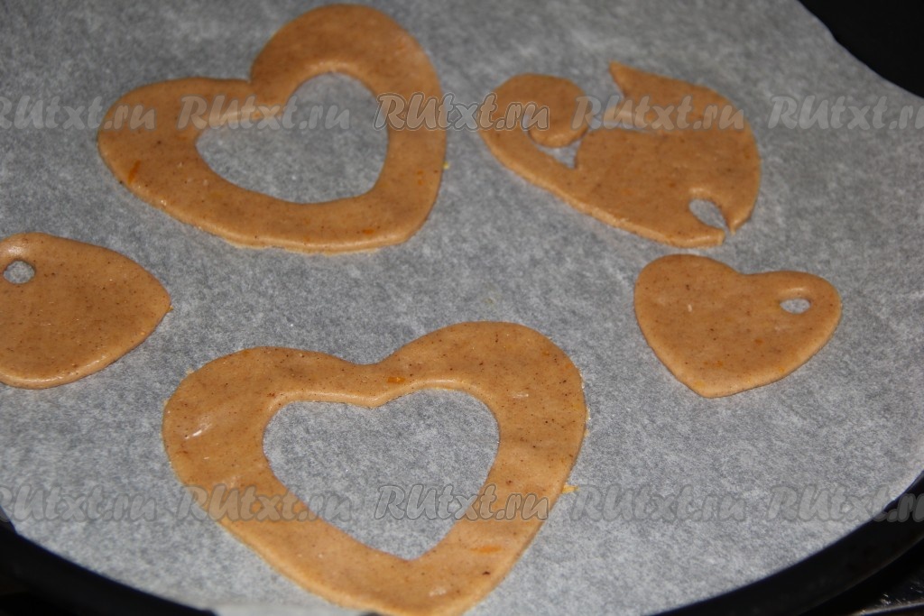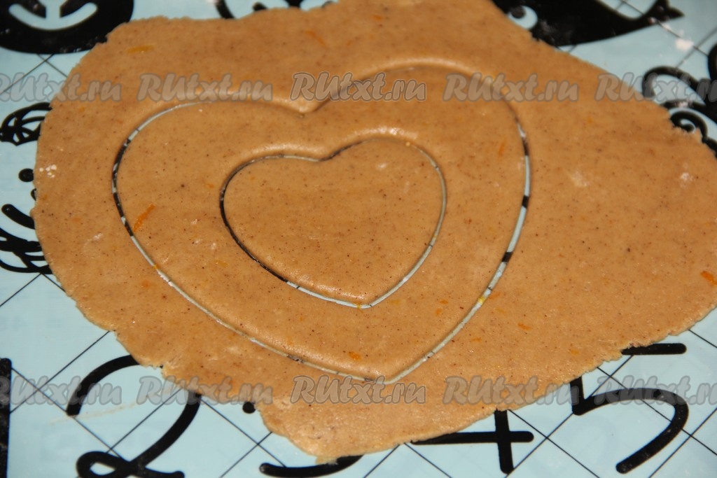Готовое тесто разделить на несколько частей и раскатать в тонкий пласт (толщина пласта, примерно, 3-5 мм). Работать лучше с холодным тестом, в этом случае оно не стягивается и не деформируется. Поэтому пока работаете с одной частью теста, оставшееся тесто пусть лежит в холодильнике. Затем вырезать печенье любой формы. Я вырезала печенье в форме сердечек.