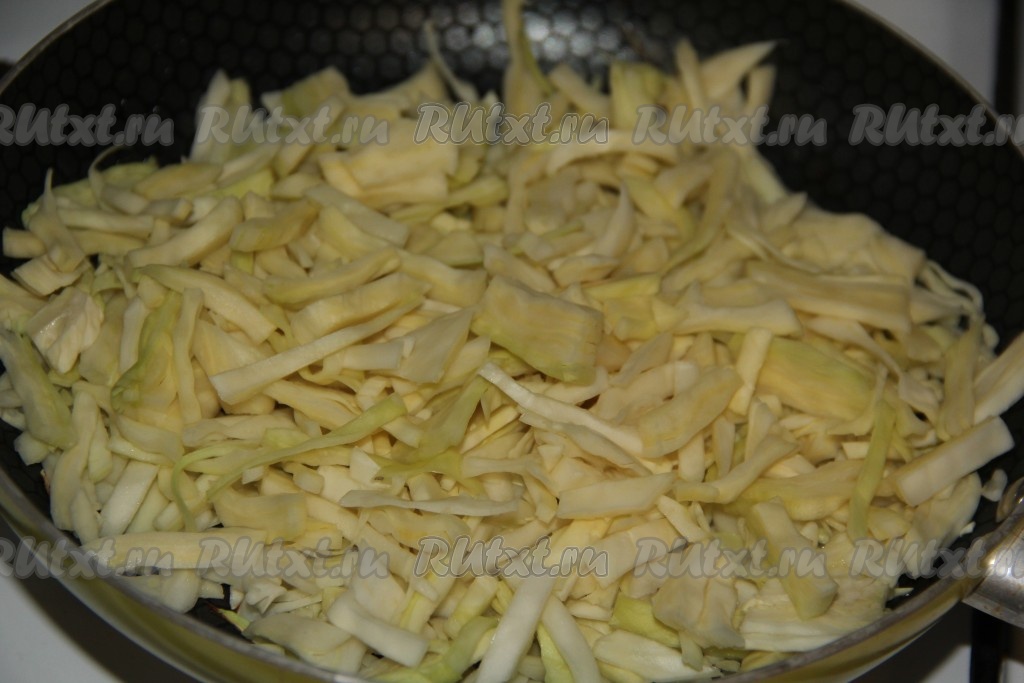 Капусту нашинковать и выложить в сковороду с добавлением растительного масла.