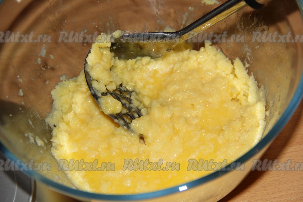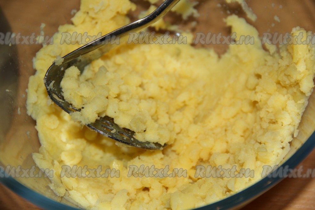 Картофель очистить и отварить в подсоленной воде до готовности (в течение минут 20-25), затем слить воду. Выложить вареную картошку в глубокую миску.